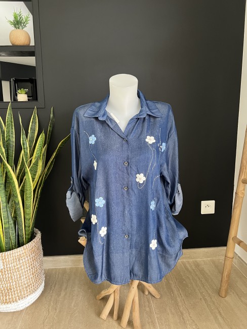 Chemise fluide effet jeans avec fleur brodée sur le devant plus longue derrière et plus courte sur le devant